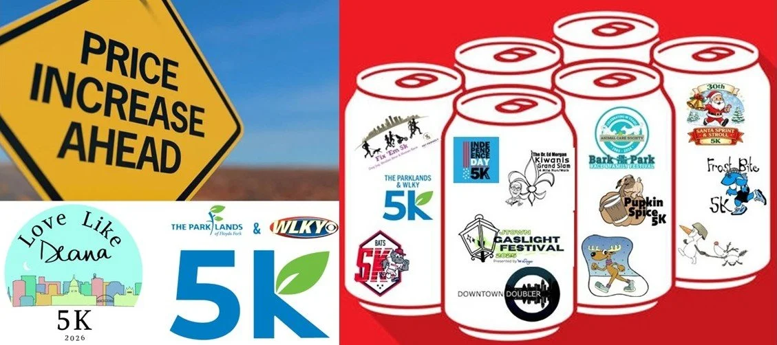 Price increase this Saturday night at midnight for the Love Like Deana 5k and The Parklands & WLKY 5k which also means the earliest of early bird prices for the Run the 502 Six Pack increases. Details and to register, click on the race logo at the right.